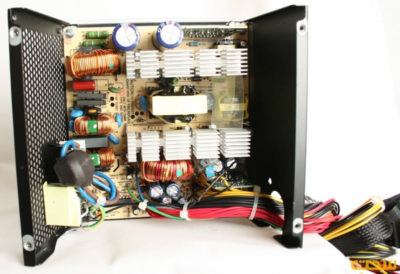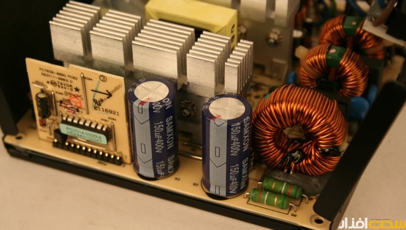 داخل منبع‌تغذيه و در بخش اولیه، شاهد خازن‌های X و Y تعبیه‌شده در دو بخش فیلتر پشت کانکتور اصلی و لاین فیلتر روی برد هستیم. در بخش ورودی این منبع‌تغذيه از دو خازن تايواني الکترولیت SamXon 85˚C با ظرفیت 150µF و 400V استفاده شده‌است. ترانزیستورهای سوئیچینگ اصلی، بخش مدار تصحیح ضریب توان و قطعات‌ یکسوکننده خروجی این منبع‌تغذيه روی دو خنک‌کننده آلومینیومی با ضخامت مناسب پنج ميلي‌متر چیده شده‌اند.