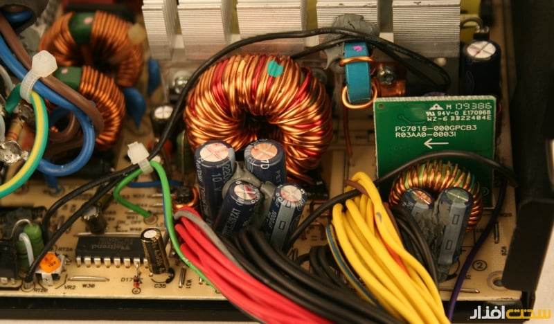 (طراحی و چینش کابل‌ها و کانکتورها و بهره‌گیری از هفت عدد کانکتور IDE نشان‌دهنده طراحی قدیمی در بخش کابل‌کشی این منبع‌تغذيه است).