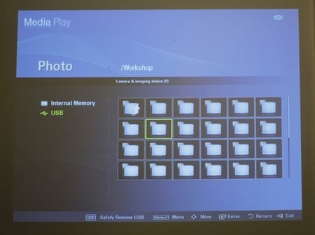 در اين دستگاه، میتوان انواع حافظههای فلش و هارددیسکهای خارجی را به پورت USB متصل کرد و فایلهای درون آن را بدون نیاز به کامپیوتر تماشا کرد، البته محدودیتهای خاصی نيز در این زمینه دیدهمیشود. پردازنده داخلی در نمایش فایلهای تصویری، ویدئو و فایلهای PDF که در آن از آبجکتهای زیادی استفاده شده، کند عمل میکند و شاید بتوان گفت، تنها بخشی که میتوان روی آن حساب کرد، نمایش فایلهای نرمافزار Office و فایلهای PDF است. با این حال، در اینجا نیز، در نمایش متون فارسی در فایلهای doc ،docx و اکسل مشکلاتی دیده میشود (فایلهای PDF فارسی بدون مشکل نمایش دادهمیشوند). نمایش فهرست پوشهها نیز میتوانست بسیار بهتر از این باشد. هنگامي که میخواهید عکسهای روی حافظه فلش را تماشا کنید، تنها شکل پوشهها و پیشنمایشی از فایلها نمایش دادهشده و نام آنها بالای صفحه قرار میگیرد، این در حالی است که در بخش فایلهای آفیس، نام فایل در کنار آیکون آنها نمایش دادهمیشود.