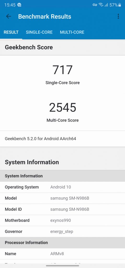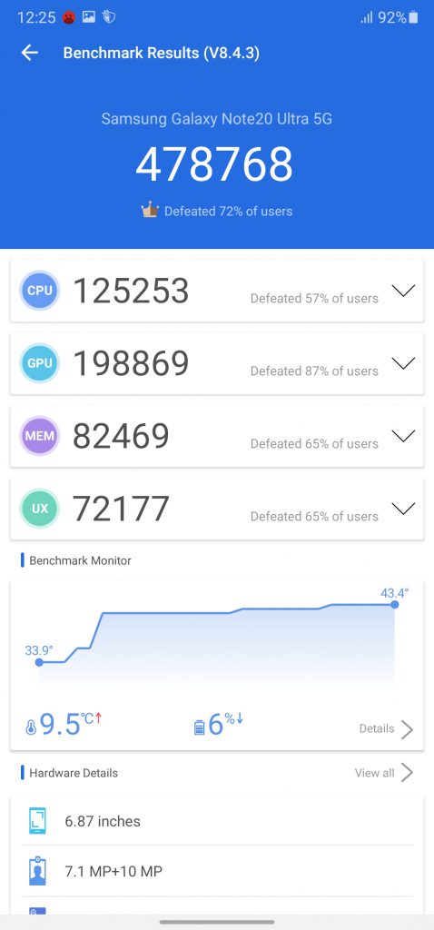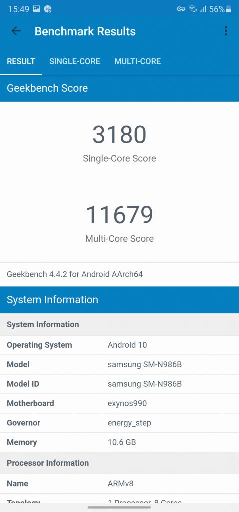 برای اینکه ببینیم عملکرد سخت‌افزاری نوت 20 اولترا به چه صورت است، در ابتدا به سراغ تست‌های بنچمارک رفتیم. همانطور که در ادامه مشاهده خواهید کرد، نوت 20 اولترا با چیپست اگزینوس 990 در اندازه یک پرچمدار واقعی ظاهر شده و امتیازات این را به خوبی نشان می‌دهند. البته قابل پیش‌بینی بود که امتیازهای کسب شده توسط این گوشی بهترین نباشد و در مقایسه با رقیبانی که اسنپدراگون 865+ و حتی 865 معمولی راهی بازار شده‌اند، در رتبه پایین‌تری قرار بگیرد.