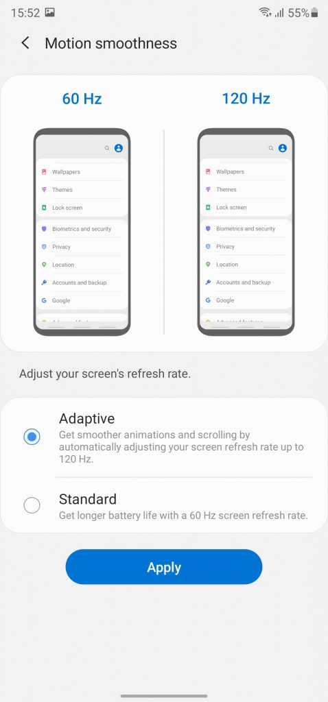 مانند گوشی‌های سری S20، در نوت 20 اولترا هم ریفرش ریت بالاتر محدود به رزولوشن 1080p است. این یعنی اگر بخواهید از بالاترین رزولوشن نمایشگر (1440p) بهره ببرید، باید نرخ نوسازی نمایشگر را بر روی 60 هرتز تنظیم کنید. محدود بودن نرخ نوسازی بالاتر به رزولوشن 1080p همچنان محدودیتی است که امیدواریم در آپدیت‌های آینده برداشته شود. البته بخش تنظیمات نرخ نوسازی نمایشگر حالا کمی تغییر کرده است و شما دیگر برخلاف S20های سامسونگ نمی‌تواند، مستقیماً حالت 120 هرتز را انتخاب کنید. چرا که حالا گزینه‌های Adaptive  و Standard جایگزین 120 هرتز و 60 هرتز شده‌اند و در حالت آداپتیو، نمایشگر بسته به آنچه در جریان است، نرخ نوسازی را تنظیم می‌کند.