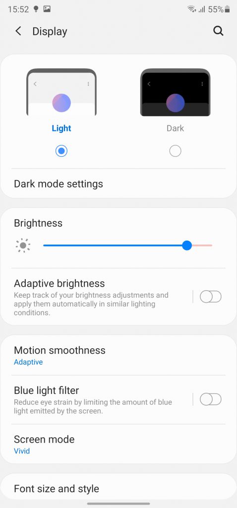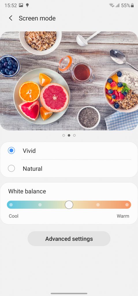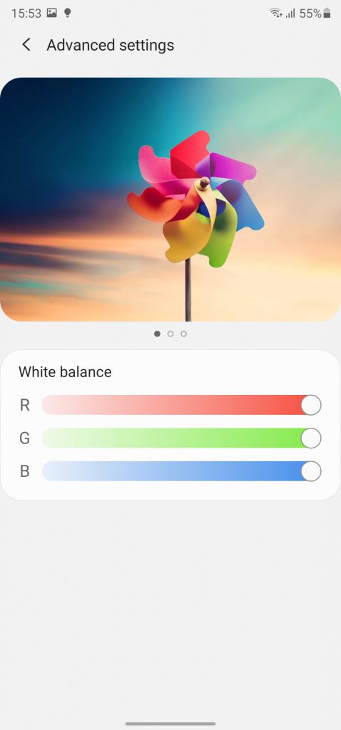 در بخش تنظیمات نمایشگر، گزینه‌ای برای انتخاب تم تاریک یا روشن، تنظیم میزان روشنایی دستگاه به صورت دستی یا خودکار، تنظیم نرخ نوسازی نمایشگر، حذف نورهای آبی و نوع نمایشگر در نظر گرفته شده است. در Screen Mode دو گزینه Vivid و Natural در نظر گرفته شده و علاوه‌براین امکان تنظیم White Balance برای گرمی و سردی بیشتر جنس تصاویر و رنگ‌های RGB نیز در این بخش لحاظ شده است. در حالت تنظیمات Natural  نیز فضای رنگی sRGB تحت پوشش قرار دارد که رنگ‌های طبیعی‌تر و کم‌تر اشباع‌شده‌ای را به نمایش می‌گذارد. البته برای استفاده عمومی تنظیمات نمایشگر در حالت Vivid چشم‌نوازتر به نظر می‌آیند.