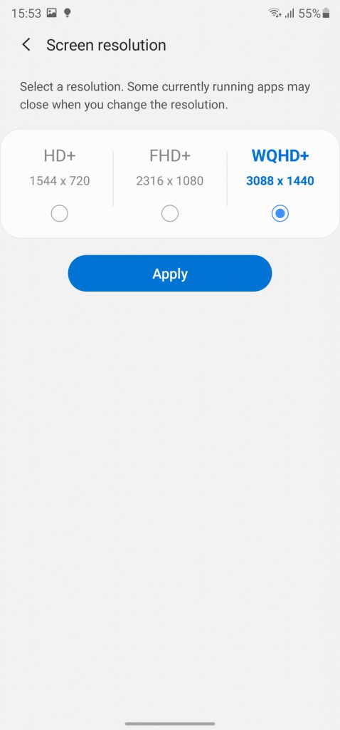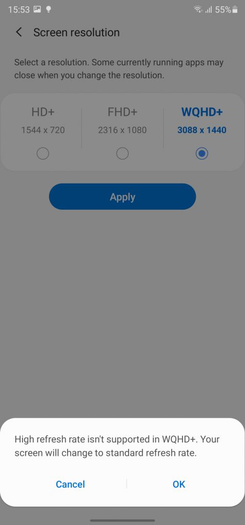 .در بخش Screen Resolution نیز شما می‌توانید دقت تصویر را بر روی یکی از گزینه‌های HD+، FHD+ و WQHD+ قرار دهید که در گزینه آخر، حالت 120 هرتز غیرفعال خواهد بود. یکی از دیگر گزینه‌های منوی نمایشگر،  Accidental Touch Protection (برای جلوگیری از لمس‌های اتفاقی)است. با در نظر گرفتن اینکه لبه‌های نمایشگر این گوشی خمیده است و در اوایل کار امکان لمس اشتباه بسیار بالا بوده، این یک گزینه بسیار کاربردی است.