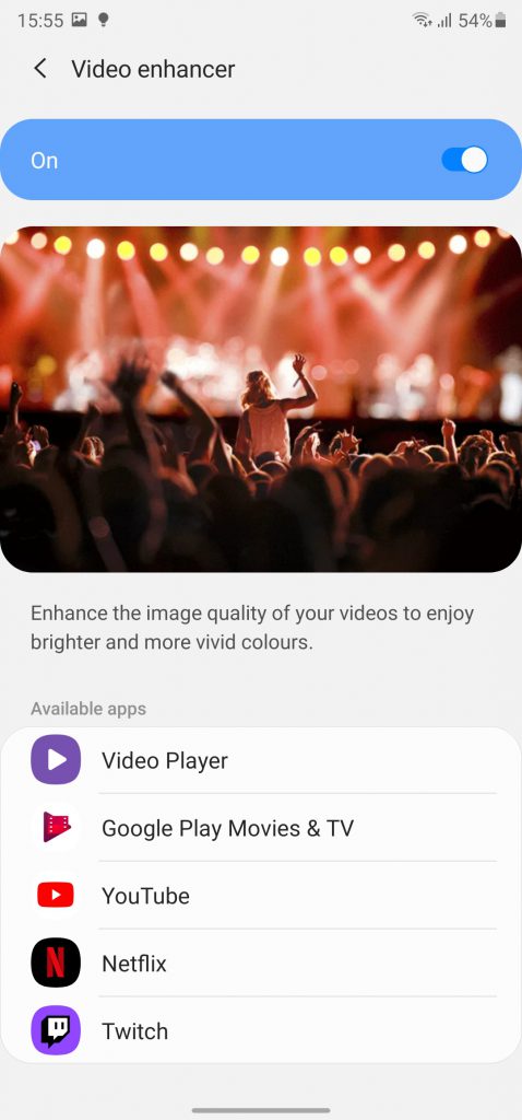 Video Enhancer یکی دیگر از امکاناتی بوده که در بخش تنظیمات گوشی گلکسی نوت 20 اولترا است که با بالابردن کیفیت تصاویر ویدئوها، آنها را روشن‌تر و رنگ‌های زنده‌تر به چشمان کاربران ارائه می‌کند. این قابلیت در حال حاضر، برای 5 برنامه Video Player، یوتیوب، Google Play Movies & TV ، نتفلیکس و توئیچ در دسترس است. تنظیمات دیگری که در بخش نمایشگر این گوشی وجود دارد، مانند Edge Screen و Navigation Bar، مواردی هستند که به‌طور معمول در تمامی گوشی‌های سامسونگ آنها را دیده‌ایم.