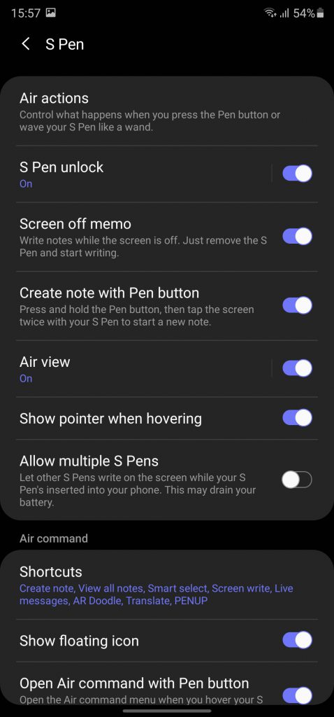 با تمام امکانات ریز و درشت و بسیار بسیار زیادی که نسل جدید قلم S-Pen با خود در نوت 20 اولترا به همراه آورده است، شاید کاربردی‌ترین آنها، همان امکانات اولیه باشد. یکی از این قابلیت‌های کاربردی بیرون آوردن قلم در حالت نمایشگر خاموش و شروع به نوشتن کردن است. در زمان روشن بودن نمایشگر هم بیرون آوردن قلم در حالت پیش‌فرض منجر به ظاهر شدن منو Air command می‌شود. در این منو به صورت پیش‌فرض کاربردی‌ترین امکانات و برنامه‌های قلم گوشی قرار گرفته‌اند که البته تمامی آنها قابل جایگزینی است.