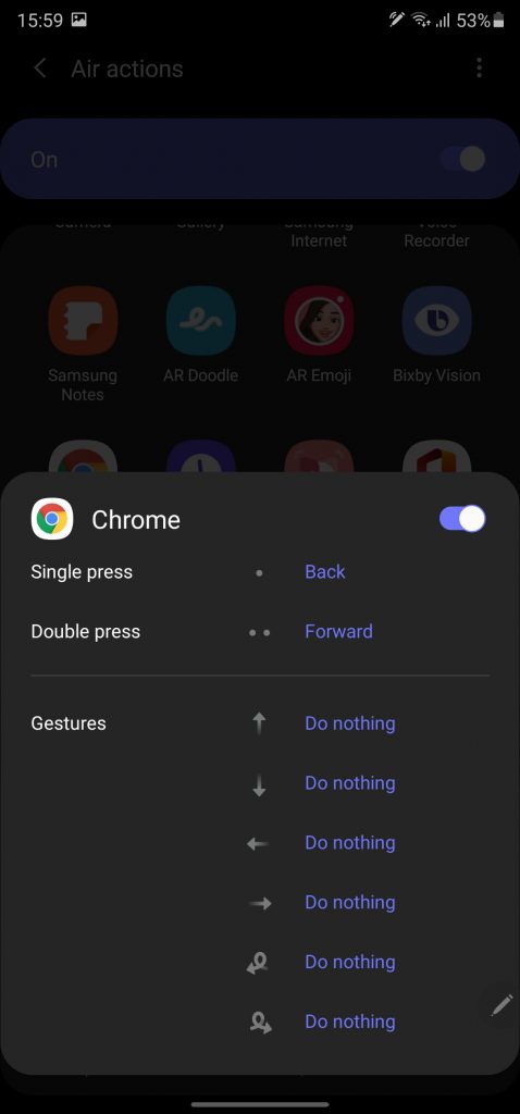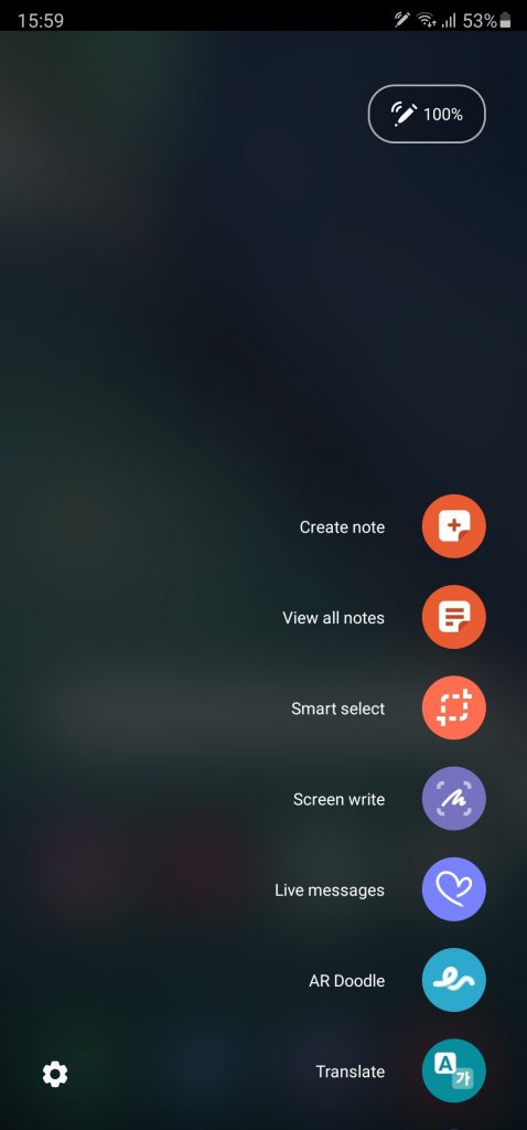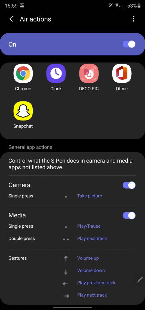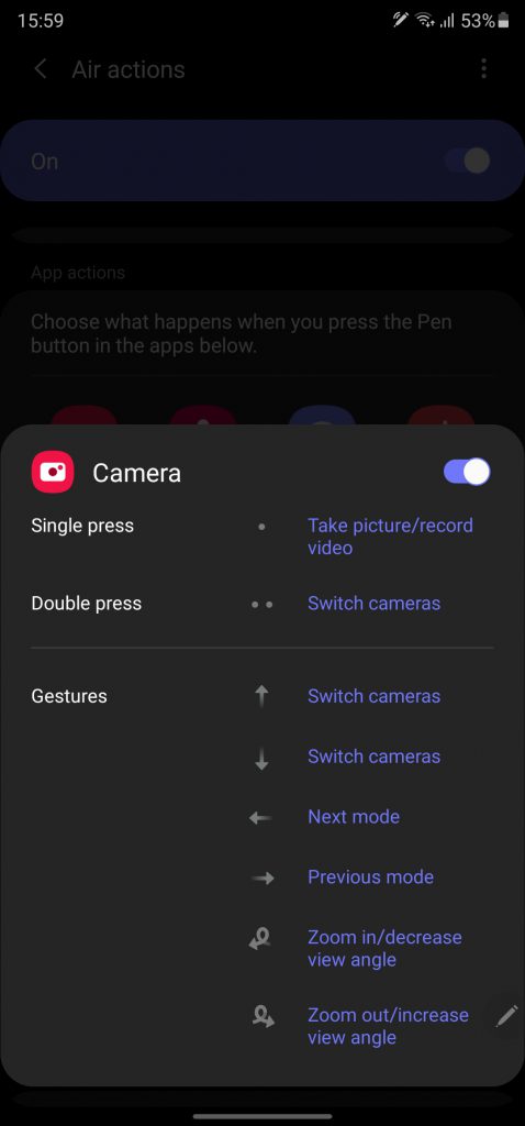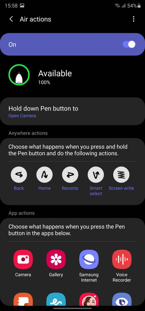 قابلیت جدید دیگر این قلم، Anywhere actions است که با استفاده از آن می‌تواند از قلم خود از هر نقطه تنها با نگه داشتن کلید آن و ژست‌های هوایی عملیات انجام دهید. 5 حرکت برای این منظور تعریف شده که Back، Home، Recent، Smart Select و Screen Write آن را تشکیل داده‌اند. علاوه‌براین با قابلیت App action شما قادر خواهید بود تا انتخاب کنید قلم در هر کدام از برنامه‌ها به چه صورت عمل کند و یا اصلاً هیچ تأثیری نداشته باشد. در کنار این موارد، قابلیت‌های Air actions هم با ژست‌های هوایی قادر به انجام عملیات در محیط گوشی است.