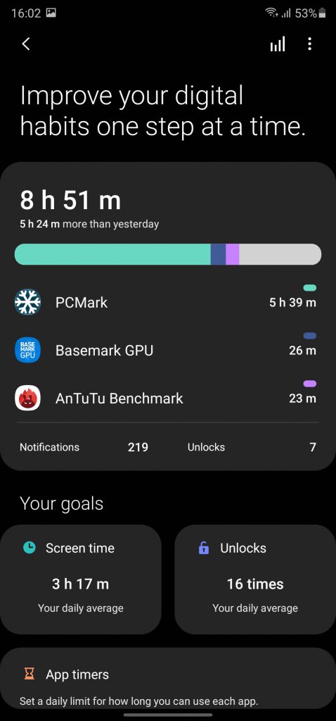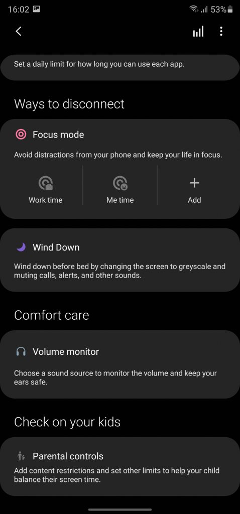 در کنار این موارد، امکانات دیگری نیز هستند که نقش چندان مثبتی در میزان مصرف باتری ندارند. به عنوان مثال قابلیتAOD یا صفحه نمایش همیشه روشن که از جذاب‌ترین قابلیت‌های گوشی‌های سامسونگ به حساب می‌آید، می‌تواند سرعت تخلیه باتری را به‌طور نامحسوس بالاتر ببرد. البته این گزینه حالا به لطف تنظیمات جدید امکان آن را دارد که فقط در صورت لمس نمایشگر فعال ‌شود وبدین ترتیب میزان مصرف باتری توسط این قابلیت کمتر از گذشته خواهد شد. قابلیت Digital well-being و Parental Control نیز در نرم‌افزار گوشی نه تنها شما را از مدتی که در برنامه‌های مختلف می‌گذرانید مطلع می‌کند؛ بلکه می‌توانید محدودیت‌هایی برای استفاده شما یا فرزندنتان از گوشی و برنامه‌های آن نیز اعمال کند.