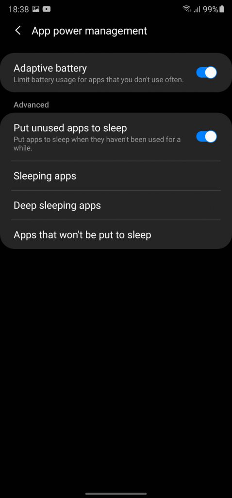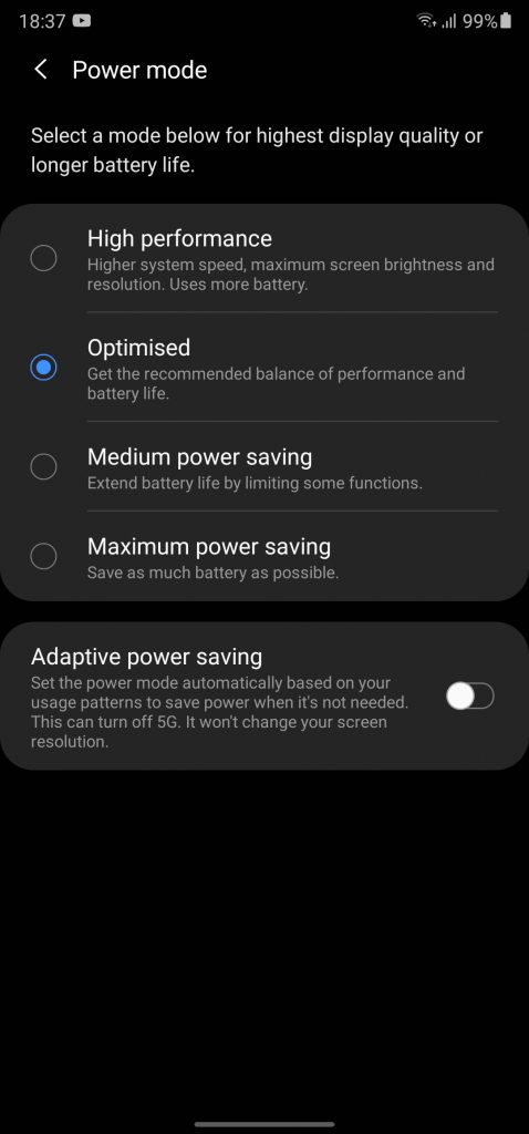سامسونگ در بخش تنظیمات Power Mode باتری، چهار حالت برای بهینه‌سازی مصرف انرژی در نظر گرفته است. High Performance (بالاترین سطح عملکرد)، Optimized (بهینه)، Medium-power saving (سطح میانی ذخیره انرژی) و Maximum power saving (بالاترین سطح ذخیره انرژی). به صورت پیش‌فرض باتری گوشی در حالت بهینه قرار دارد، اما در زمانیکه نیاز به مدیریت مصرف باتری است و امکان شارژ گوشی وجود ندارد، دو حالت پاور سیو می‌تواند بسیار کاربردی واقع شوند. در صورتیکه هم که قصد داشته باشید از تمام قدرت گوشی استفاده کنید، می‌توانید گزینه High Performance را انتخاب کرده که در این صورت میزان مصرف باتری همانگونه که ما در طول بررسی تجربه کردیم، بسیار بالاتر خواهد رفت.