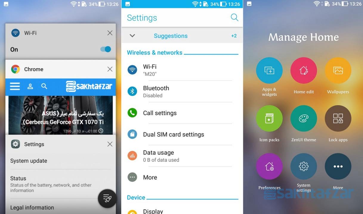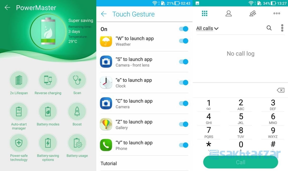 یکی از امکاناتی که در Zen UI در اختیار کاربران قرار می گیرد، امکان اجرای برخی دستوارت با لمس کردن صفحه به شکل حروف انگلیسی است. برای مثال اگر روی صفحه حرف C را بکشید اپلیکیشن دوربین اجرا خواهد شد و کشیدن حرف W برنامه آب و هوا را نمایش می دهد. این تنظیمات قابل برنامه ریزی و شخصی سازی هستند و ایده جالبی برای ایجاد میانبر به نظر می رسند. از دیگر ویژگی های کاربردی در Zen UI می توان به امکان خاموش کردن صفحه با دو بار تپ روی نمایشگر اشاره کرد که می تواند در مصرف کلید پاور صرفه جویی کند.