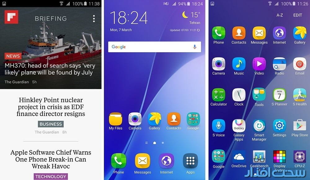 A7 با اندروید لالی پاپ نسخه 5.1.1 عرضه می شود و طبق روال مرسوم رابط کاربری پیشفرض آن با رابط اختصاصی TouchWiz جایگزین شده است. با در نظر گرفتن تاریخ عرضه اندروید 6.0 و همچنین گوشی موبایلی چون HTC One A9 که یک ماه زودتر از A7 با اندروید 6 عرضه شد، دوست داشتیم A7 را دستکم تا به این لحظه با اندروید مارشملو (از طریق عرضه بروزرسانی) ببینیم. از آنجایی که نوار ناوبری به صورت سخت افزاری در دسترس قرار گرفته، فضای بیشتری را در رابط کاربری در اختیار داریم. لیست تاریخچه اپلیکیشن ها که از آن به “کارهای در حال اجرا” هم یاد می شود، همان ساختار پشته ای باب شده از اندروید 5 را داراست. نوار میانبر تنظیمات که سامسونگ از آن به “Quick Settings” یاد می کند، با ناحیه اعلان یا Notification Area ترکیب شده است. نوار Quick Settings تا نهایت 10 میانبر را در خود جای می دهد و می توانید 5 گزینه از پیش تعیین شده دیگر را جایگزین موارد درون آن کنید. S Finder در پایین این نوار قابلیتی کاربردی است که می تواند هر چیزی را درون گوشی از لیست تماس ها و اپلیکیشن ها (به مانند قابلیت جستجوی گوگل در اندروید) گرفته تا تنظیمات، فایل ها و بیش از آن را بیابد و میانبر بزند. خوشبختانه TouchWiz لیست اپلیکیشن ها را از صفحات خانگی جدا می کند و امکان مدیریت بهتر فضای کاری را می دهد. نخستین صفحه خانگی از سمت چپ به BRIEFING تعلق دارد و در آن می توانید مجموعه ای از اخبار روز را در زمینه های مختلف و از فیدهای خبری گوناگون در قالبی دسته بندی شده مطالعه نمایید.