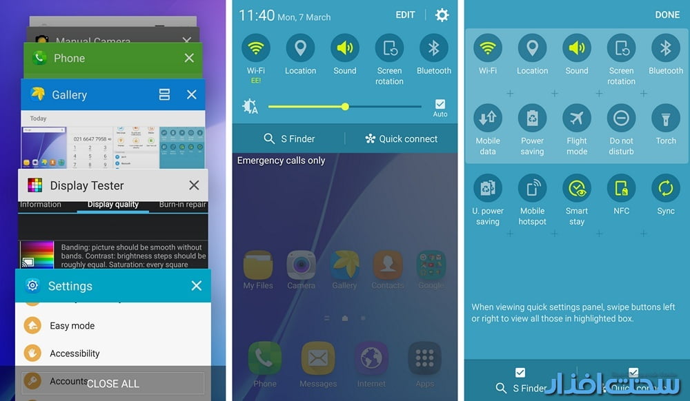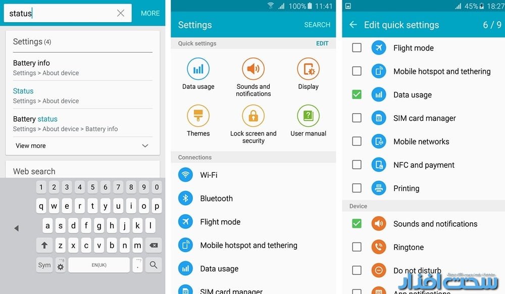 S Finder در چپ و ناحیه Quick Settings در راست