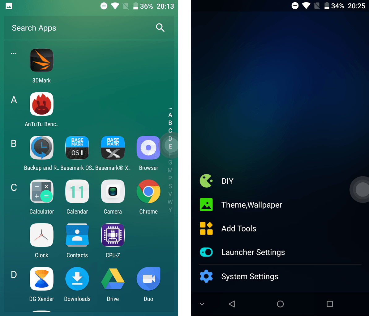 البته این مورد حالت میانبر نصب Theme است که در سیستم عامل اندروید وجود دارد. اگر چند ثانیه دست خود را روی صفحه نمایش نگه دارید یک منو باز می شود. اولین گزینه این منو DIY است که با استفاده از ان می توانید با استفاده از آن اندازه فونت، رنگ و موارد دیگر را در تم گوشی تغییر بدهید. البته با استفاده از این منو می توانید به موارد دیگری مانند Launcher Settings و System Settings هم دسترسی داشته باشید. برخلاف پیکسل XL در منوی اصلی اپلیکشین ها براساس حرف اولشان ردیف شده اند. یعنی اپلیکشین با حرف A درست در زیر حرف A قرار داد و ردیف بعدی با حرف B شروع میشود. البته اگر اپلیکشینی با عدد شروع بشود در بالای منو قرار داده می شود. به طور کلی مدیریت اپلیکشین ها در این حالت راحت تر است چون شما دقیقا می توانید هر اپلیکشین را در زیر حرف مورد نظر ببینید.