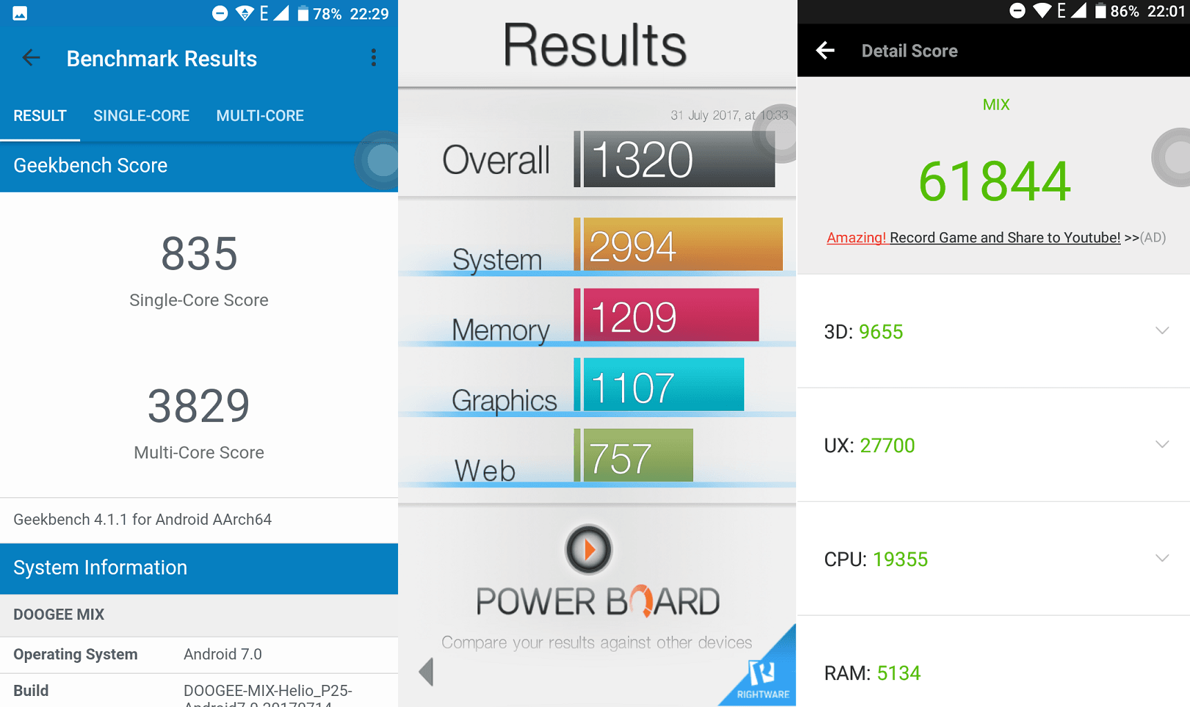 مانند دیگر محصولاتی که در وب سایت تست کردیم در تست این گوشی هم به سراغ اپلیکشین های استانداردی رفتیم که توسط بیشتر وب سایت های معروف نیز استفاده می شود.  اپلیکشین GeekBench 4 اولین گزینه ما برای تست این گوشی بود. در این اپلیکشین MIX توانست در حالت پردازش تک هسته ای و دو هسته ای به ترتیب امتیاز 835 و 3829 را بدست اورد که با توجه به مشخصات فنی امتیاز مناسبی است. در اپلیکشین معروف Antutu هم MIX امتیاز کل 61844 را بدست بیاورد. این امتیاز در مقایسه با رقبای قدرتمند و پرچمدار به طور حتم کمتر است اما در رده محصولات همرده امتیاز خوبی است. Basemark OS II سومین اپلیکشینی بود که به سراغش رفتیم. در این تست کارایی گوشی در زمینه های مختلف مورد ارزیابی قرار میگیرد که این موضوع می تواند نماد خوبی برای محک کارایی گوشی در زمینه های مختلف باشد. در این تست MIX  توانست امتیاز کل 1320 را بدست بیاورد.