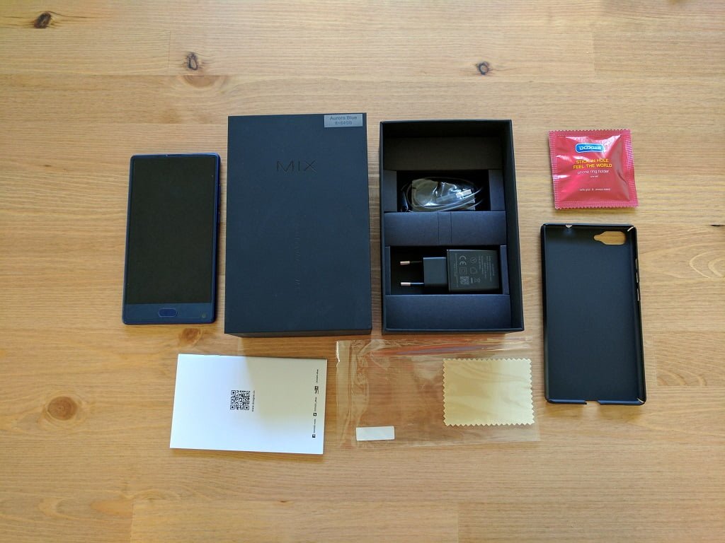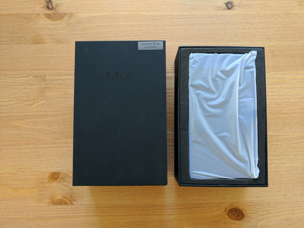 اولین چیزی که در بسته بندی گوشی MIX توجه شما را به خود جلب می کند اسم این گوشی است که از ترکیب MINI+MAX=MIX بدست امده است و درست روی درب جعبه درج شده است. وقتی درب جعبه را باز می کنید گوشی در یک کاور پلاستیکی سفید قرار داده شده است. با برداشتن ان به یک بسته مشکی مستطیلی دسترسی خواهید داشت که در داخل آن قاب گوشی و یک محافظ صفحه نمایش و دفترچه راهنمای کوچک گوشی قرار دارد. البته به صورت پیش فرض خود گوشی دارای محافظ صفحه نمایش است اما در صورتی که نیاز داشته باشید می توانید از  محافظ اضافی قرار داده شده استفاده کنید. در جعبه گوشی علاوه بر این موارد اداپتور دو آمپری، کابل و نگه دارنده گوشی برای قرار دادن گوشی روی میز هم تعبیه شده است. در کل امکانات موجود در داخل جعبه با در نظر گرفتن قیمت این محصول منطقی است. البته به همه این موارد باید یک پین را هم اضافه کنید که برای دسترسی به اسلات سیم کارت و حافظه کاربرد دارد.