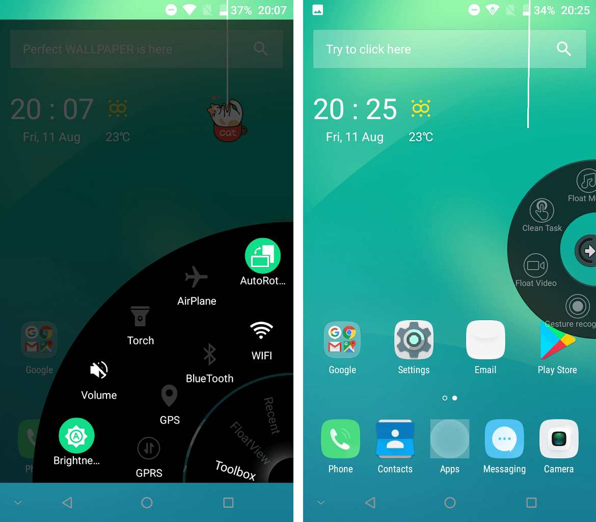 MIX مانند ایفون دارای یک آیکون دسترسی سریع به بعضی امکانات است که براساس نوع نیاز می توانید آن را براحتی در مکان های مختلفی از صفحه نمایش قرار دهید. وقتی روی این دایره سفید رنگ کلیک می کنید امکاناتی مانند دسترسی به حالت بازی، مطالعه، Float Video، پاک کردن دستور العمل های جاری، موسیقی، قفل کردن صفحه نمایش و  تشخیص Gesture  است. اما این تمام امکانات نرم افزاری قابل دسترسی در این گوشی نیست. شما می توانید با قرار دادن انگشت در قسمت سمت راست و پایین صفحه نمایش و کشیدن آن به سمت وسط صفحه نمایش به یک به منوی میان بنر دیگری دسترسی پیدا کنید که دارای بخش های مانند Toolbox، Floatview وRecent  است.