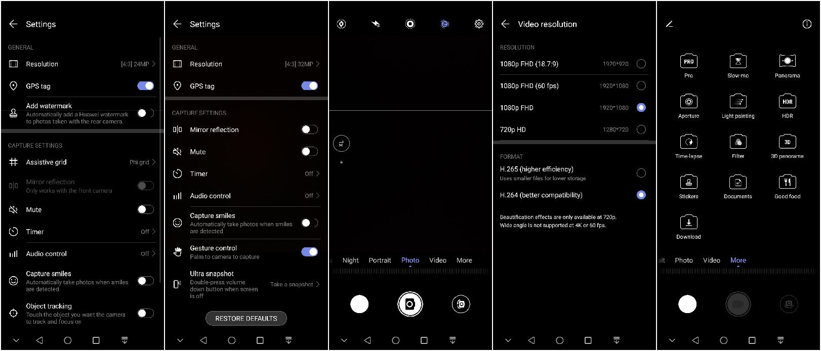 به غیر از تنوع سخت‌افزاری دوربین‌های پی30 لایت، طیف مناسبی از حالت‌های مختلف عکسبرداری و فیلمبرداری در رابط کاربری آنها فراهم شده است. کیفیت کلی خروجی دوربین‌های این گوشی تفاوت چندانی با دیگر گوشی‌های هوآوی ندارد و همچنان در همه آنها تصاویر کمی بیش از اندازه برای ظهور جزئیات شارپ شده است و در بعضی موارد نیز می‌توان شاهد اوراکسپوز شدن عکس‌ها بود.