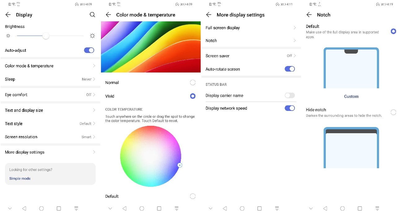 در منوی تنظیمات مربوط به نمایشگر شاهد گزینه‌های معمول مربوط به این قسمت هستیم. برجسته‌ترین گزینه‌ها در این قسمت مربوط به تنظیمات رنگ و رزولوشن است. در تنظیمات رنگ به‌صورت پیش‌فرض گوشی در حالت Vivid قرار دارد، که فضای رنگی DCI-P3 را تحت پوشش قرار می‌دهد. اما ممکن است برای برخی در این حالت قسمت‌های سفید تصویر کمی سردتر به نظر برسد، به همین دلیل بدون نیاز به تغییر رنگ از حالت vivid به حالت نرمال هم، با انتخاب گزینه Warm از بین سه گزینه Default، Warm و Cool دما رنگ را می‌توان تغییر داد یا حتی از فضای رنگی تعبیه شده در این قسمت دمای رنگ را به‌صورت کاملاً سلیقه‌ای انتخاب کرد. در حالت تنظیمات نرمال فضای رنگی sRGB تحت پوشش قرار دارد که رنگ‌های طبیعی‌تر و کم‌تر اشباع‌شده‌ای را به نمایش می‌گذارد. البته معمولاً برای استفاده عمومی تنظیمات ویوید چشم‌نوازتر به نظر می‌آیند. تنظیمات رزولوشن نیز این امکان را در اختیار کاربر قرار می‌دهد تا بتواند از میان دو حالت HD+ و FHD+ و حالت Smart رزولوشن موردنظر خود را انتخاب کند. به‌صورت پیش‌فرض در تنظیمات این بخش گزینه اسمارت فعال شده و این موضوع به جهت صرفه‌جویی در مصرف انرژی انجام گرفته است.