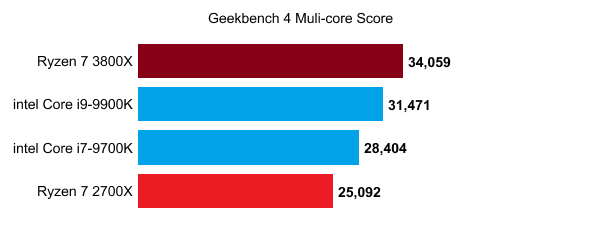 به هر حال Ryzen 7 3800X در آزمون Geekbench 4 موفق به کسب امتیازهای 5604 برای تک هسته و 34059 برای تمام هسته شده است. این آزمون با یک مادربرد X470 و 16 گیگابایت حافظه DDR4 صورت گرفته است. در آزمون تک هسته ی Geekbench 4 پردازنده Intel i9 9900K با کسب امتیاز 6236 رقیب تازه وارد را شکست داده اما در تمام هسته، به دلیل احتمالا کش کمتر و معماری قدیمی تر، امتیاز 31471 را به خود اختصاص داده است. باید کمی منتظر مانده تا در هفته های آتی بنچمارکهای بیشتری از این پردازنده منتشر شود.