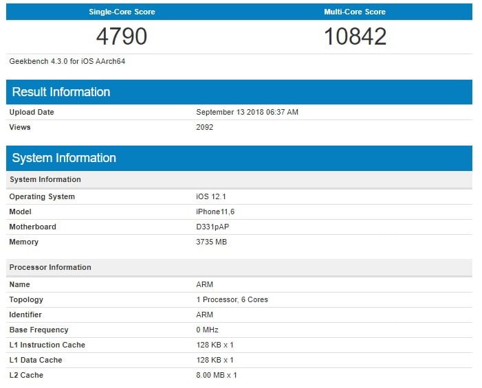جدای از بخش امتیازات، نتایج Geekbench جزئیات جدیدی در خصوص پردازنده A12 Bionic اپل را نشان میدهد. این تراشه دارای 6 هسته با فرکانس پردازش 2.49 گیگاهرتز است، در حالیکه چیپ A11 فرکانس 2.39 گیگاهرتز داشت. علاوه براین نتایج به ما می گوید که حداقل یکی از دو آیفون جدید دارای 4 گیگابایت حافظه رم خواهد بود و کش L1 بزرگتر 128 کیلوبایتی در مقایسه با 32 کیلوبایت خواهد داشت.