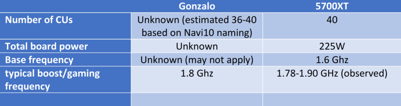 ((مشخصات Gonzalo در مقایسه با Radeon RX 5700 XT))