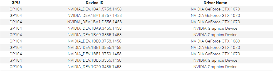 اطلاعات جدید حاکی از آن است که در صورت شروع سریال/شناسه با 1Bxx می توان مطمئن بود که در آن از سیلیکون های GP104 استفاده گشته است؛و در صورتی که شناسه مورد نظر با 1Cxx آغاز شد،نشان از استفاده سیلیکون GP106 است.اطلاعات تائید نشده از سوی انویدیا،نشان می دهد که GTX1080 مورد استفاده در لپ تاپ ها دارای 2048 هسته CUDA یعنی مقداری کمتر از نسخه دسکتاپ است.در نتیجه به طور حتم می توان گفت که مقداری ناچیزی تفاوت پرفورمنس در این کارت گرافیک ها وجود دارد.