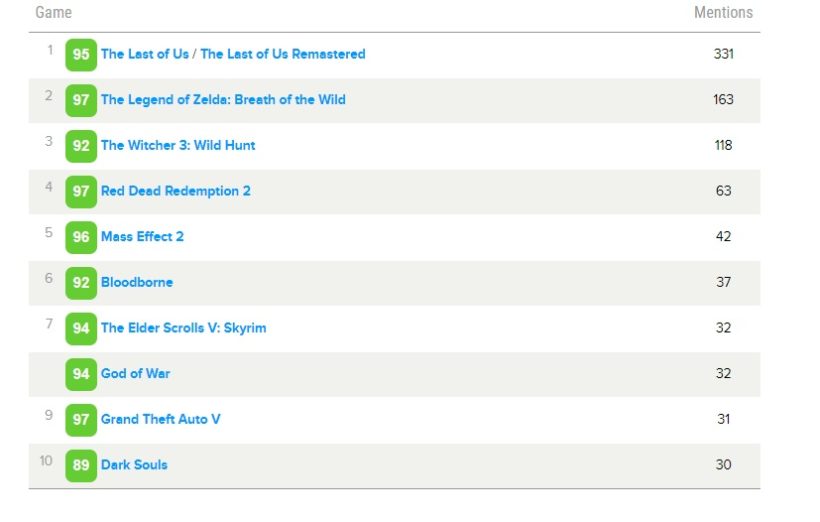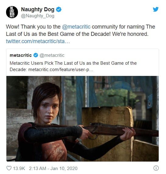 در ادامه این جدول، Read Dead Redemption 2 در جایگاه دوم و Mass Effect 2، Skyrim، God of War و GTA V به ترتیب عناوین چهارم، پنجم، هفتم، هشتم و نهم را کسب کرده اند. ناتی داگ در واکنش به انتخاب The Last of US به عنوان بهترین بازی دهه در متاکریتیک توییتی را منتشر کرده و از جامعه متاکریتیک از این بابت تشکر کرده است. در سال جدید احتمالا شاهد انتشار دومین قسمت The Last of US خواهیم بود که احتمالا شاهکار دیگری خواهد بود و باید دید آیا قسمت دوم این بازی بی نظیر میتواند حتی برای دهه جدید نیز، برترین بازی لقب بگیرد یا خیر.