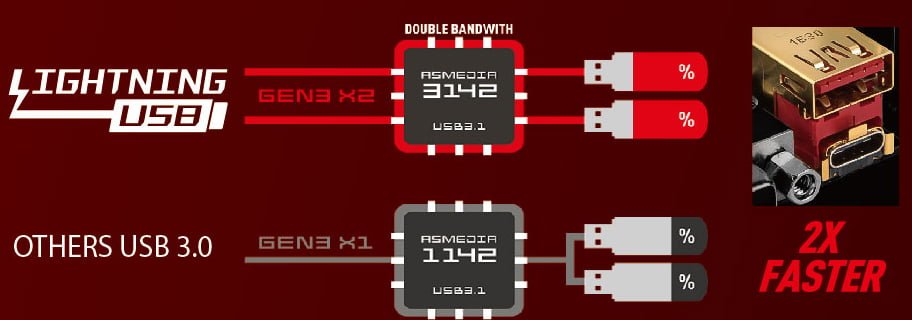 کنترلر پرسرعت ASMEDIA ASM3142   برای درگاه های USB 3.1 GEN 2  موسوم به  Lightning USB خدمت گرفته شده و کارایی بالاتر از کنترلرهای معمولی را ارائه می کند.