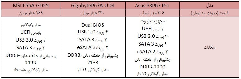 توصیه ما این است به سراغ سیستم‌های Sandy Bridge بروید و از امکانات و کارایی فوق‌العاده آنها استفاده کنید. در اين مادريورد مسیر‌های PCI-E  مستقیماً توسط پردازنده تأمین می‌شود، با این حال در زمان SLI کردن، هشت مسیر PCI-E برای هر کارت‌گرافیک باقی می‌ماند که این مقدار برای کارت‌های گرافیک میان قیمت ما کاملاً کافی هستند. جدول 2 چند مادربورد خوب و خوش قیمت از این سری را نمایش می‌دهد (طبق معمول قیمت‌ها حدودی هستند).