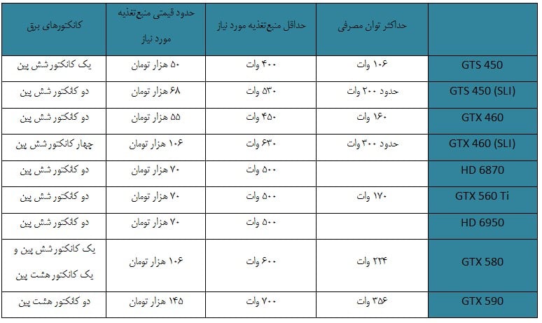 جدول 3 توان مصرفی هر کارت‌گرافیک و حداقل منبع‌تغذیه مورد نیاز برای هر‌یک را نشان می‌دهد. مقدار توان مصرفی کارت‌گرافیک در زمان SLI بودن دو برابر نمی‌شود، زیرا هیچ گاه هر دو کارت‌گرافیک به صورت 100 درصد درگیر پردازش تصویر نخواهند بود. پس توان مصرفی حالت SLI از مقدار ذکر شده در جدول کمی پایین‌تر خواهد بود.