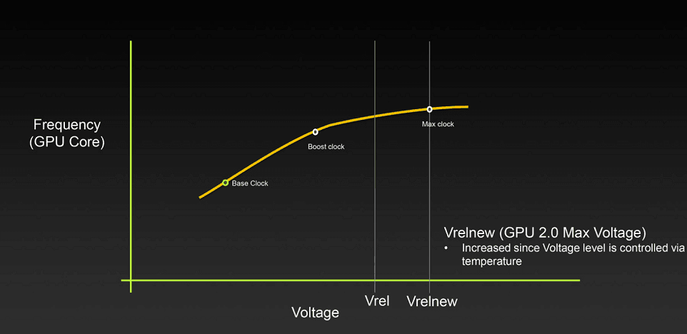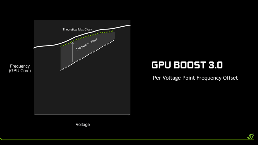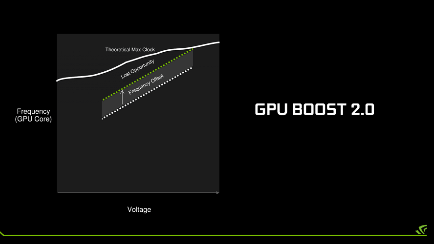 مسئله دیگری که در این کارت گرافیک ها رویت خواهد شد، فرکانس GPU است. معماری، لیتوگرافی و طراحی الگوریتم به یک طرف، اما فرکانس به طور سنتی همچنان یکی از مهمترین عواملی است که در پرفورمنس کارت گرافیک ها دخیل است. NVIDIA در فکر یک برنامه جدید برای تکنیک افزایشی فرکانس یا GPU Boost است. نسل چهارم از GPU Boost در کارت گرافیک های جدید Geforce اعمال خواهد شد. در نسل چهارم این فناوری، GPU Boost دارای یک الگوریتم جدید است که عملکرد را به نسبت انرژی تنظیم کرده و توان حرارتی و بهره وری نیرو را در پی دارد.