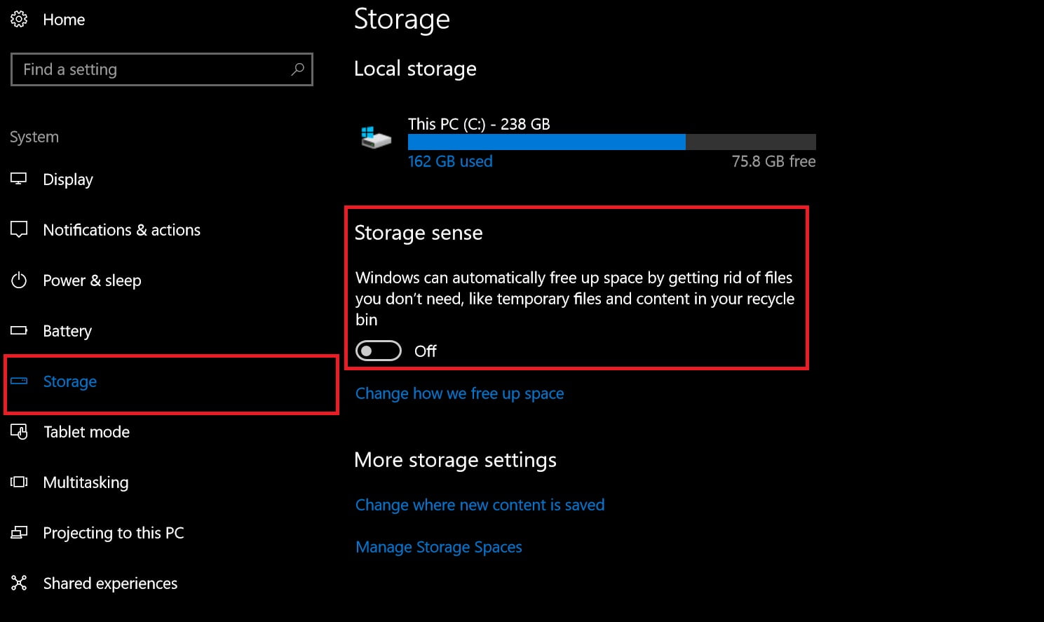 در سمت چپ پنجره جدید گزینه های مختلفی وجود دارند که می بایست روی تب Storage کلیک کنید. در نهایت در میانه صفحه گزینه انتخابی زیر عنوان Storage Sense را روی on قرار دهید.