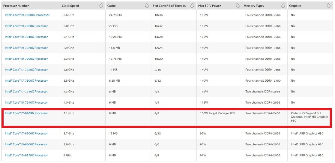 در بخش CPU استفاده از 4 هسته و 8 رشته تائید شده است؛ پردازشگر گرافیکی AMD Radeon RX Vega M نیز برای آن در نظر گرفته شده است. 8 مگابایت حافظه کش سطح L3 در کنار پشتیبانی از 4 کانال رم DDR4 با فرکانس پایه حداقل 2400 مگاهرتز، از جمله دیگر ویژگی های Core i7-8809G هستند. فرکانس پایه از 3.10 گیگاهرتز آغاز و به 3.9 گیگاهرتز می رسد؛ به طور حتم عدم افزایش فرکانس CPU به منظور کنترل TDP است. و اما مهمترین اطلاعات این مطلب مربوط به بخش پردازشی AMD Radeon RX Vega M GH است. گرافیک یکپارچه ی این پردازنده دارای 4 گیگابایت حافظه گرافیکی مجزا است که از نوع HBM2 بودن و دارای یک رابط حافظه 1024 بیتی است.