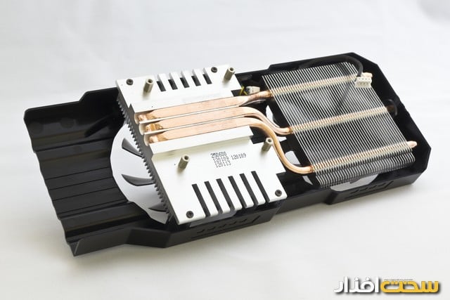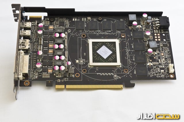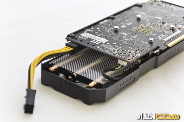 با جدا کردن سیستم خنککننده از روی کارتگرافیک ساختاری ساده زیر آن ديدهميشود. ماژولهای حافظه ساخت Hynix و از مدل H5GQ2H24MFR هستند. مدار رگولاتور چهار فاز پردازندهگرافیکی نیز در بخش جلو قرار گرفته و گرمای آن به سرعت به بیرون از کارتگرافیک دمیده میشود. همانطور که اشاره شد، توان موردنیاز کارتگرافیک توسط یک اتصال شش پین تأمین شده و یک منبعتغذیه پانصد واتی به خوبی میتواند نیاز آن را برطرف کند.