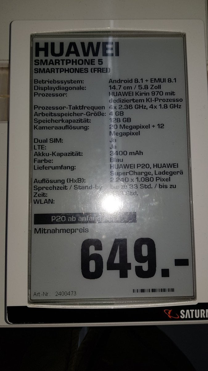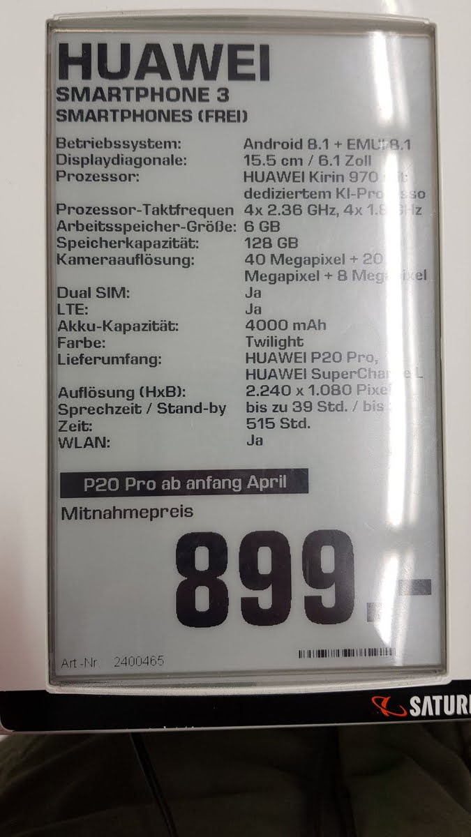 یکی از کارمندان این فروشگاه از تگ قیمت سه گوشی جدید هواوی که قرار است فردا معرفی شوند، پی20، پی20 پرو و لایت تهیه کرده است و آن را اینترتت منتشر کرده است. به نظر میرسد که پی20 و پی20 پرو از آن چیزی که انتظار میرود کمی گرانتر باشد. با این حال شایعات قبلی در خصوص دوربین سه گانه پی20 پرو با سنسورهای 40 مگاپیکسلی اصلی، 20 مگاپیکسلی مونوکروم و 8 مگاپیکسلی تله فوتو درست به نظر میرسد.