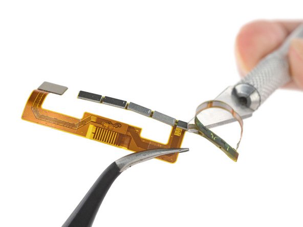 سنسور حساس به فشار که در تصویر پایین مشاهده میکنید، شامل یک بُرد PCB انعطاف پذیر می باشد که به همراه یک فشار سنج در هر دو طرف گوشی قرار گرفته است. این فشار سنج ها، مقاومت های حساس نسبت به تغییر شکل می باشند و زمانی که کمی کشیده یا فشرده می شوند، مقاومت آنها تغییر میکند و به این طریق است که نرم افزار می تواند حرکت های فشاری را تعریف پذیر کند. یک پورت USB-C هم برروی این بُرد وجود دارد که امکان جایگزینی آن در صورت ایجاد مشکل بسیار راحت است. ![]()