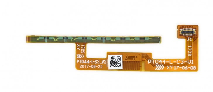 سنسور حساس به فشار که در تصویر پایین مشاهده میکنید، شامل یک بُرد PCB انعطاف پذیر می باشد که به همراه یک فشار سنج در هر دو طرف گوشی قرار گرفته است. این فشار سنج ها، مقاومت های حساس نسبت به تغییر شکل می باشند و زمانی که کمی کشیده یا فشرده می شوند، مقاومت آنها تغییر میکند و به این طریق است که نرم افزار می تواند حرکت های فشاری را تعریف پذیر کند. یک پورت USB-C هم برروی این بُرد وجود دارد که امکان جایگزینی آن در صورت ایجاد مشکل بسیار راحت است. ![]()