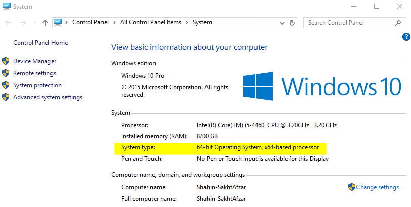 • حال باید در پنجره ی باز شده، خط System Type را که در اسکرین شات هم با رنگ زرد مشخص شده است چک کنید. در این قسمت به شما معماری 32 یا 64 بیتی پردازنده ی شما نمایش داده میشود. اگر طبق تصویر معماری پردازنده ی مورد استفاده ی شما 64 بیتی بود شما میتوانید نسخه ی 64 بیتی ویندوز 10 را روی سیستم خود نصب کنید.
