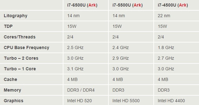 از آنجایی که اینتل این سه نسل از پردازنده های خود را در یک بازه زمانی کوتاه معرفی و وارد بازار کرده است،این معرفی خالی از لطف نخواهد بود.لازم به ذکر است که در این مطالب تنها بر روی مدل های i7 متمرکز خواهیم بود.همانطور که در مقدمه نیز به آن اشاره کردیم،هر سه نسل همچنان در بازار موجود بوده و در تجهیزات کامپیوتری مورد استفاده قرار می گیرند.البته پردازنده های نسل ششم به کندی در حال ورود هستند اما نمیتوان تاثیر و قدرت آنها را انکار کرد.نمونه های مورد بحث در گذشته عموما متمرکز بر قدرت پردازش و توان خروجی بوده اند.خانواده Q دارای 4 هسته و 8 رشته پردازشی هستند.اما بر خلاف آنها خانواده پردازنده های کم مصرف یا Ultra Low Volt که با پسوند U شناخته می شوند،متمرکز بر کاهش توان مصرفی هستند که به طبع سبب کاهش قدرت پردازشی نیز می گردد.این پردازنده ها در هر سه نسل (i7)،دارای 2 هسته و 4 رشته پردازشی هستند.در نتیجه برای متوجه شدن تعداد هسته و میزان قدرت آنها،توجه به مدل و پسوند الزامی است.پردازنده های مد نظر در این مطلب شامل مدل های مطرح i7-4500U،i7-5500U و i7-6500U هستند.بر خلاف پردازنده های چهار هسته ایی،(Q) اینتل تغییر چندانی در مدل های U به وجود نیاورده است.هر سه مدل در توان مصرفی 15 وات فیکس هستند و دارای دو رشته و 4 رشته پردازشی هستند.علاوه بر آن حافظه نهان (Cache) تمامی مدل ها 4 مگابایت است.تا به اینجای کار هیچ تفاوتی در آنها دیده نمی شود.دو پردازنده 4500 و 5500 از رم های DDR3 پشتیبانی می کنند و این در حالی است که 6500 از حافظه های DDR4 نیز پشتیبانی به عمل می آورد.حداکثر فرکانس قابل پشتیبانی برای رم های DDR4 در 6500U برابر با 2133 مگاهرتز است.