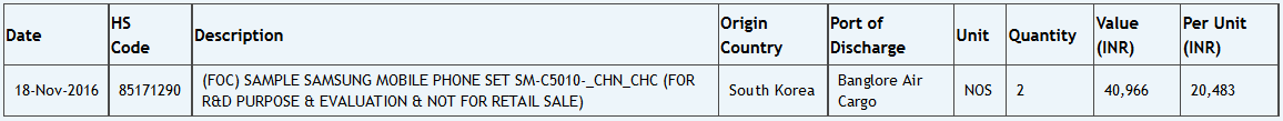 شهریور ماه سال جاری بود که خبری را در مورد احتمال معرفی نسخه ی پرو دو گوشی گلکسی C5 و گلکسی C7 منتشر کردیم. این دو گوشی در دسته ی گوشی های رده بالا قرار میگیرند و پیش بینی میشود که سامسونگ طی ماه آینده هر دو گوشی را احتمالا به طور همزمان معرفی کند و امروز C5 Pro در وب سایت صادرات و واردات کشور هند موسوم به Zaubia دیده شده است. همان طور که میدانید سازندگان پیش از معرفی محصولات خود، تعدادی از دستگاه ها را به منظور توسعه، تحقیق و بررسی وارد کشور هایی مانند چین، هند و امریکا میکنند تا پس از تائید نهایی، این دستگاه ها به طور رسمی و وارد بازار شوند.
