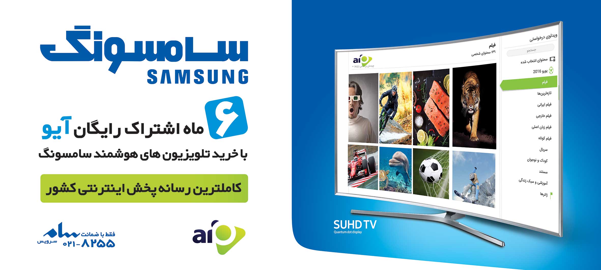 در جشنواره سامسونگ-آیو که از بهمن ماه ۱۳۹۵ شروع شده است، با خرید تلویزیون هوشمند، سامسونگ به همه خریداران یک اشتراک رایگان ۶ ماهه «آیو»، هدیه میدهد، در نتیجه این مشترکین میتوانند بدون کم شدن حجم اینترنت خود از تماشای فیلمها و سریالهای مورد علاقهشان بر روی تلویزیون سامسونگ لذت ببرند. اپلیکیشن آیو که به صورت پیشفرض و انحصاری روی تلویزیونهای هوشمند سامسونگ با سیستم عامل تایزن نصب شده است، اجازه دسترسی به برنامههای صدا و سیما با امکان ضبط برنامهها و حتی بازپخش یک هفتهای برنامههای صدا و سیما را به کاربران میدهد.
