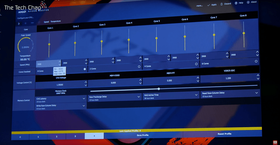 پیش از آن نیز Ryzen 7 1800X به همراه خنک کننده های LN2 مدتی را در فرکانس 5.0 گیگاهرتز به سر برده بود و این در حالی است که باز هم تمامی 8 هسته آن فعال بودند. در این آزمون زمانی که تراشه بر روی فرکانس 4.1 گیگاهرتز در حالت تمام هسته بود، اقدام جهت اخذ آزمون Cinebench R15 صورت گرفت که متاسفانه با کرش ناگهانی سیستم مواجه مواجه شده است. کنترل پنل AMD در اورکلاک شامل موارد فنی به شرح زیر است: