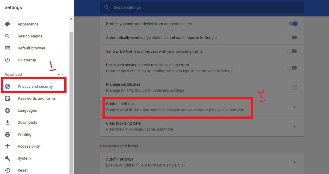 برای متوقف کردن نمایش این اعلان ها در کروم، ابتدا “سه نقطه” را در سمت راست بالای پنجره کروم انتخاب کنید و به قسمت Settings بروید. پس از آن در سمت چپ گزینه privacy and security را انتخاب کنید و مانند شکل بر روی Content Settings کلیک کنید.