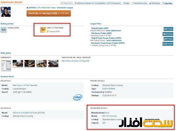 چندی پیش کمپانی ازراک مسابقه اورکلاکی به همراه HWBOT برگزار کرده بود و حالا در نتایج این مسابقه، ثبت دو رکورد 7.1 گیگاهرتز برای پردازنده Haswell مدل Core i7-4770K به چشم میخورد و در نهایت اورکلاکری از چین با نام Dfordog توانست فرکانس 7.13 را به ثبت برساند و جایزه هزار دلاری این رقابت را کسب کند.