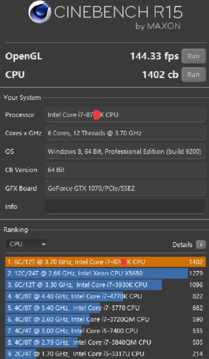 شش هسته های Coffee Lake به زودی در بازار خواهند بود و این فرصتی است که کاربران به واسطه رقابت بین AMD و Intel از آن بهره مند خواهند شد تا بدین ترتیب پس از سالها شاهد افزایش تعداد هسته های منطقی پردازنده های Mainstream باشند. به تازگی شاهد سری دوم بنچمارکهای پرچمدار این گروه با نام Core i7 8700K بوده ایم. بنچمارکهایی که ظاهرا به صورت غیر رسمی بر روی پایگاه داده وارد شده است. نخستین بنچمارکها به آزمون Cinebench CB15 می پردازد. شایان ذکر است که پردازنده مورد استفاده در تست ها، نمونه مهندسی است. امتیاز CB 1402 در آزمون Cinebench CB15 به ثبت رسیده است که یک جهش نسبتا بزرگ را نشان می دهد.