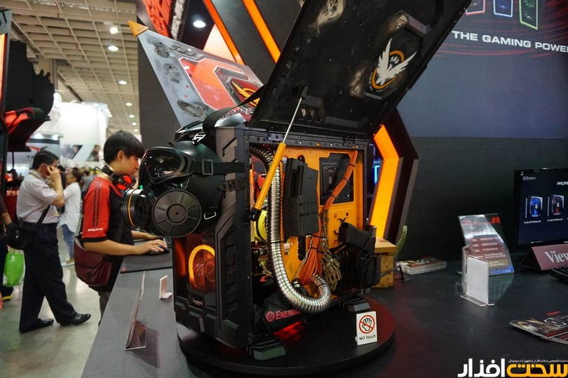 Enermax در غرفه خود محصولات متنوعی را به نمایش گذاشته بود. هدفون جدید این کمپانی با برند EAE01، واترکولرها، پاورها و اسپیکرهای بلوتوث و پرتابل از جمله این محصولات هستند. اما شاید قابل توجه ترین اثر هنری به نمایش در آمده توسط انرمکس، مودهای بسیار دیدنی آنها باشد. به خصوص یک کیس مود شده با درهایی که ظاهرا دارای جک های هیدرولیک هستند و به سبک درهای گالوینگ خودروهای مرسدس به سمت بالا باز می شوند.