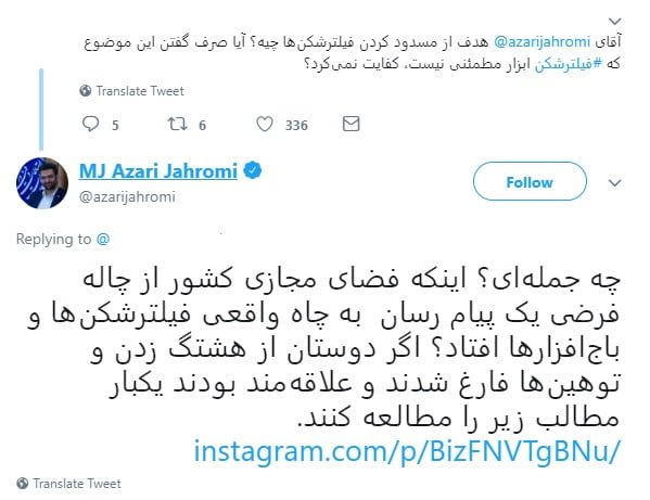 محمد جواد آذری جهرمی روز گذشته در گفت و گو با خبرنگاران از اثرات مخرب فیلترشکن ها گفت. او از نقش شرکت زیرساخت در مسدود کردن فیلترشکن ها تحت دستور رئیس جمهور خبر داد. این موضوع با واکنش تند کاربران در شبکه اجتماعی توئیتر همراه بود. زمانی که کاربری در این شبکه از وزیر ارتباطات هدف مسدود سازی فیلترشکن ها را جویا شد، جهرمی اینگونه به کاربر مورد نظر پاسخ داد.