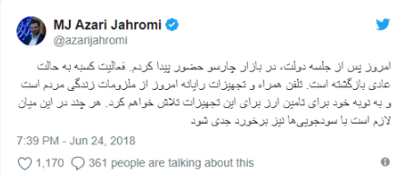 محمد جواد آذری جهرمی وزیر ارتباطات ایران پس از مطلع شدن از این اعتراضات خود را به محل رسانده و با حضور در میان معترضان آنها را به آرامش دعوت کرد. طبق اخباری که از این دیدار منتشر شده کسبه معترض بعد از حضور وزیر جوان اعتراضات خود را پایان داده و با بازگشایی مغازه های خود از غروب دیروز دوباره کسب و کار را از سر گرفتند. وزیر ارتباطات نیز کمی بعد با انتشار متنی در صفحه توییتر خود از تلاش های خود برای پیگیری مشکلات این افراد خبر داد و اضافه کرد که باید با سودجویان نیز برخورد شود.