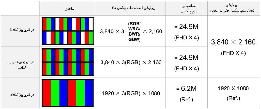 به صورت معمول سه پیکسل قرمز، سبز و آبی در تلویزیونها استفاده میشود که براساس آن پنل این تلویزیونها با عنوان RGB نامگذاری میشوند. الجی در پنلهای جدید خود ساب پیکسل سفید را هم به این سه رنگ اضافه کرده است و باعث جهش و تغییرات در این فناوری قدیمی شده است. فناوری جدید الجی باعث میشود بتوان بدون هیچ گونه از دست رفتن اطلاعات تصویری UHD، به وضوح تصویر UHD رسید. این امر باعث میشود که تلویزیونهای RGBW UHD دقیقا به اندازه تلویزیونهای UHD معمول پیکسل داشته باشند. از لحاظ کارایی کلی، پنل RGBW الجی میتواند همان کاری را انجام دهد که پنلهای سه رنگ انجام میدهند. هرچند در این میان یک تفاوت تکنیکال وجود دارد. در پنل RGBW به جای استفاده از سه رنگ اصلی قرمز، سبز و آبی، از چند نوع ترکیب رنگ مختلف به صورت RGB ، WRG، BWR و GBW استفاده میکند. پنلهای RGBW الجی از تعداد 24,883,200 (3,840×3[RGB/WRG/BWR/GBW]×2,160) پیکسل استفاده میکنند که دقیقا برابر با همان تعداد (3,840×3[RGB]×2,160) پیکسل معمول تلویزیونهای 4K است.