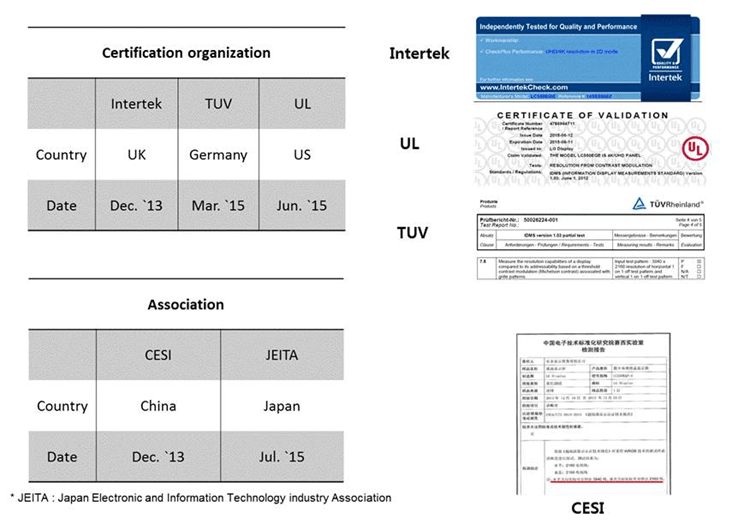 مهمترین استانداردی که هر تلویزیونی باید بگیردISO است که الجی موفق به دریافت آن شده است. بعد از آن کار به معتبرترین موسسهها و شرکتهای تایید اعتبار و استانداردسازی است که در بحث صفحهنمایش و تلویزیون سابقه طولانی دارند. سازمانهایی مثل Intertek ، TUV و UL که به صورت جهانی تعریفهای مشترکی از نحوه حساب کردن تعداد پیکسلهای تلویزیون دارند و هر سه آنها تلویزیون RGBW الجی را به عنوان 4K واقعی تایید کردهاند. همچنین بزرگترین موسسههای فناوری در ژاپن و چین یعنی JEITA و CESI هم تلویزیون الجی را به عنوان 4K واقعی تایید کردهاند. در ادامه میتوانید گواهینامههای مربوطه را مشاهده کنید.