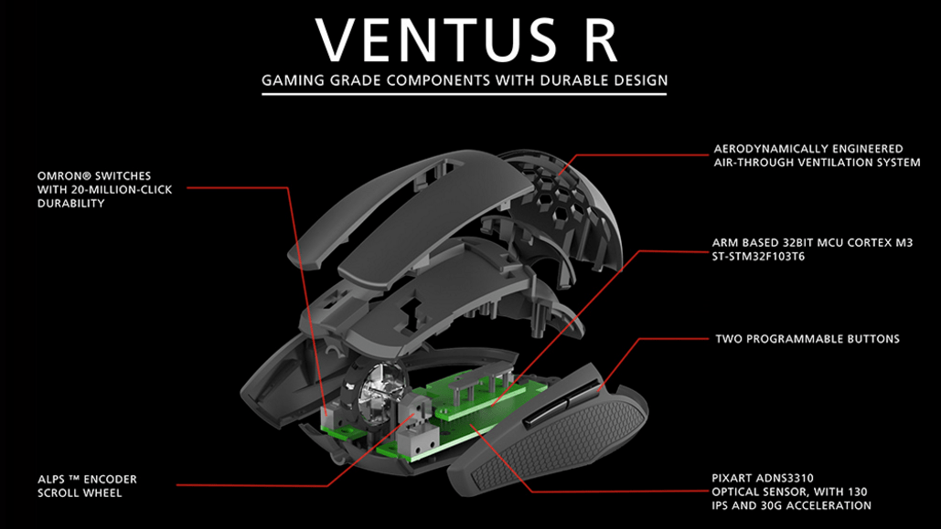 ماوس گیمینگ VENTUS در دو مدل عرضه می گردد که محصول مورد نظر ما،با نام دقیق VENTUS R و شناسه فنی MO-VER-WDOOBK-01 عرضه می گردد.این ماوس گیمینگ به منظور استفاده در هر دو دست چپ و راست طراحی شده است.تعرق دستان گیمرها،یکی از مشکلات عمومی در انجام فعالیت های طولانی مدت است.VENTUS R برای این منظور از یک طراحی منحصر به فرد بهره گرفته است.بدین ترتیب که در قسمت استراحتگاه دست،محفظه هایی وجود دارد که جریان هوا را از قسمت زیرین ماوس،به سمت بالا هدایت کرده و به آسانی موجب جلوگیری از تعرق می گردد.